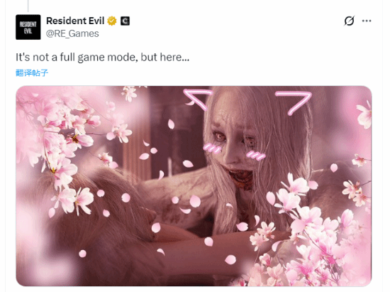 在回复神谷英树的推文时,官方账号发布了一张图片:一只正在啃咬格蕾丝的“歌唱丧尸”,被P上了猫耳、害羞脸红和飘落的樱花花瓣,整个画面瞬间变得“萌化”。