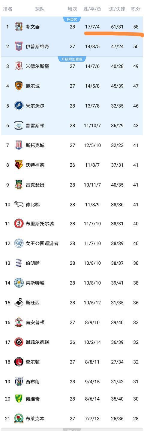可以看到考文垂取胜之后积分上涨到了58分,领先第3的米德尔斯堡队9分,直接晋级英超指日可待。而莱斯特城队打平之后,积38分排名第14,距离第6的升级附加赛区5分,可以说莱斯特城队还是有希望打入附加赛的,但是如果还是像今天这么踢,莱斯特城队可能就悬了。诺维奇取胜之后积30分排名第20领先降级区2分。