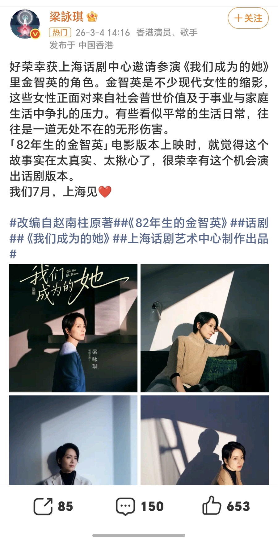 “好荣幸获上海话剧中心邀请参演《我们成为的她》里金智英的角色。”3月4日,梁咏琪表示,“金智英是不少现代女性的缩影⋯⋯有些看似平常的生活日常,往往是一道无处不在的无形伤害。《82年生的金智英》电影版本上映时,我就觉得这个故事实在太真实、太揪心了,很荣幸有这个机会演出话剧版本。我们7月,上海见。”